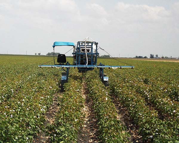A derecha en la USA Arriba : riego al desfoliante. Abajo : una cosechadora de algodón , que recoge el algodón de 7 hileras a la vez. |
