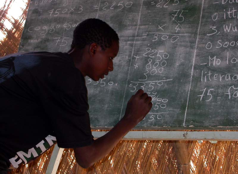 Madame Ba met la dernière main au problème qu'elle va demander à un jeune de résoudre. |
